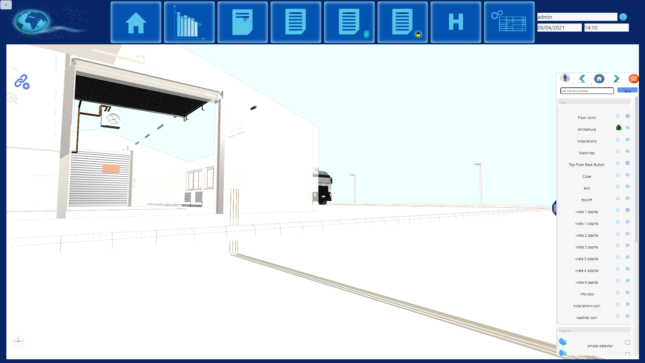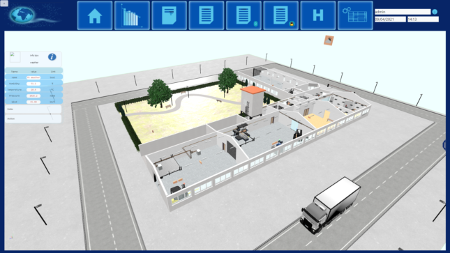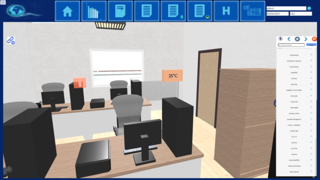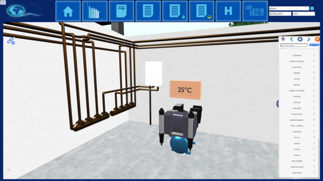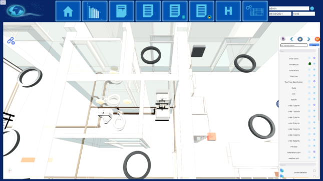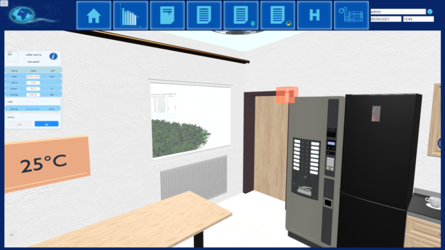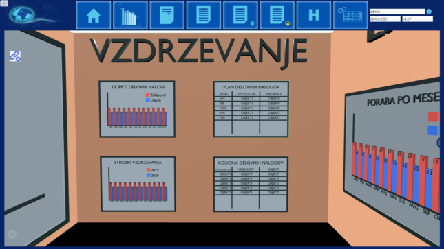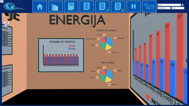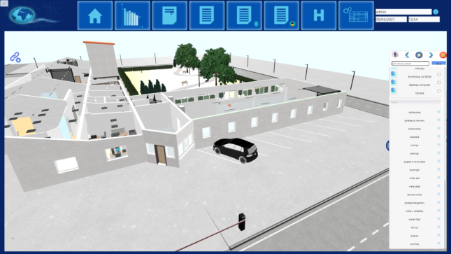 – aplikacija omogoča virtualni sprehod skozi stavbe in prikaz real-time podatkov (poraba energentov, statusi, zaposleni).